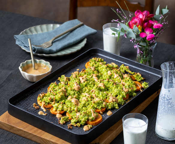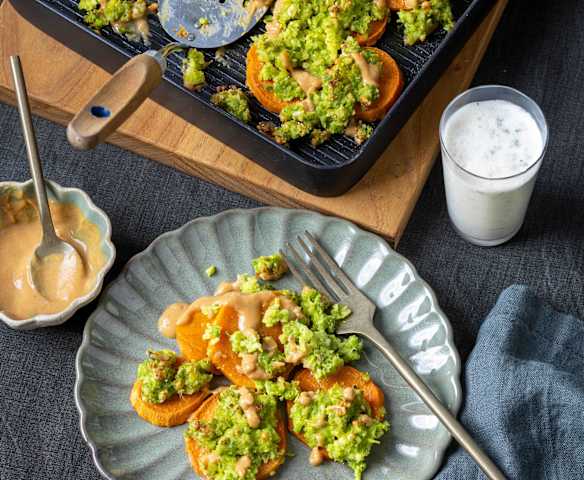 Süsskartoffeln mit Halloumi-Erbsen-Topping und Kefir-Drink
